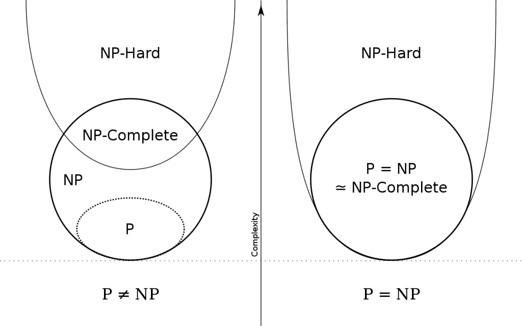 Upraszczając maksymalnie tę kwestię, problemy klasy P są NP, ponieważ można je łatwo sprawdzić. Nie wiadomo natomiast czy istnieje problem NP, który nie jest w klasie P (czyli czy P różni się od NP). Innymi słowy, czy istnieje problem, który z całkowitą pewnością można rozwiązać wyłącznie w czasie wykładniczym. Jest to jeden z problemów milenijnych i za jego rozwiązanie przewidziana jest nagroda w wysokości miliona dolarów amerykańskich.